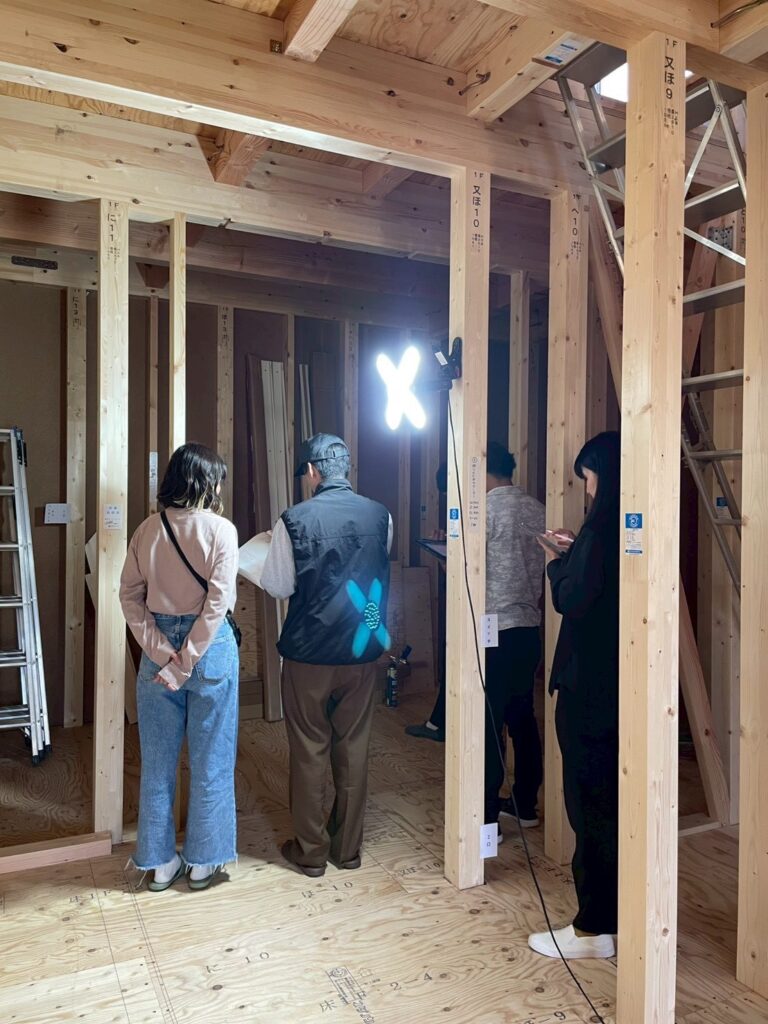 今回は、先日行われたS様邸の建築現場での一コマをご紹介します。建物の骨組みが組み上がった後、私たちは施主様をご案内し、図面上の線が現実の空間になった現場を一緒に歩きます。