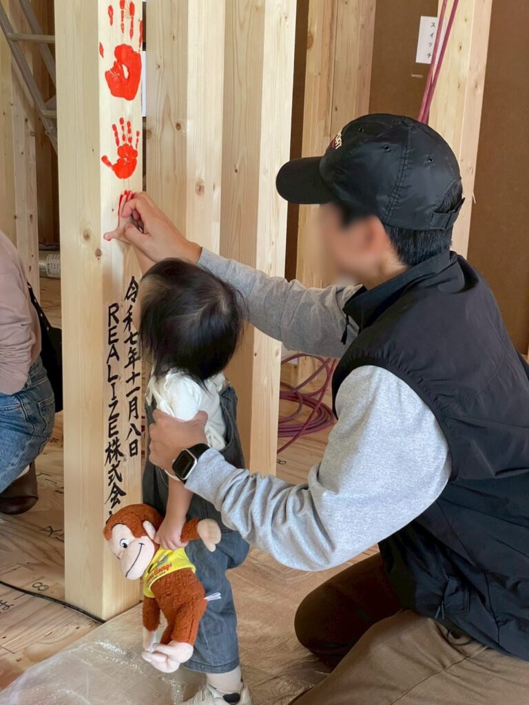 ご主人様と奥様、そしてお子様の小さな手形を朱色で柱に押された瞬間は、感動的な一コマでした。