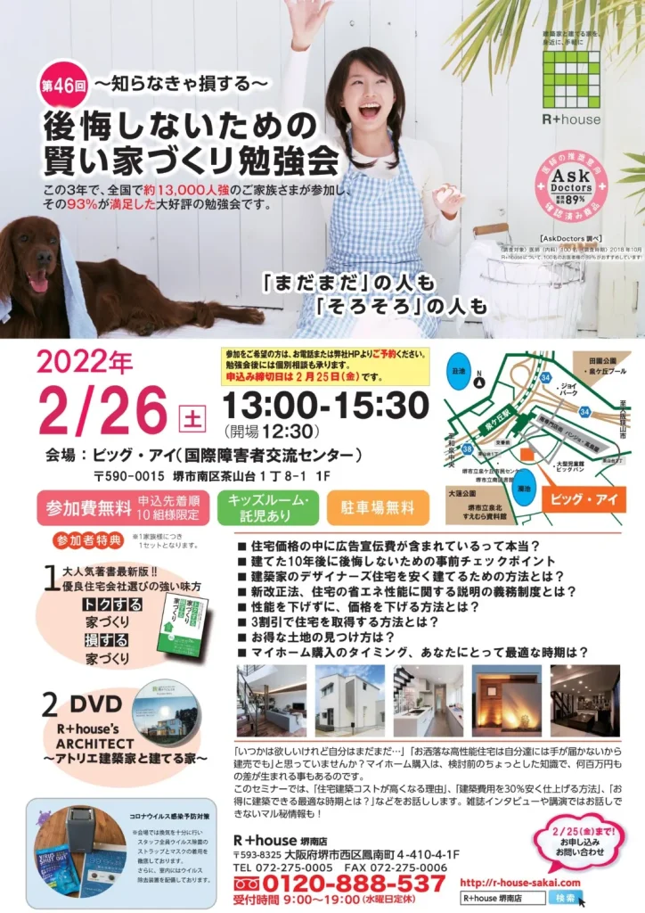 今月の「第46回 後悔しないための賢い家づくり勉強会」のご案内をいたします。