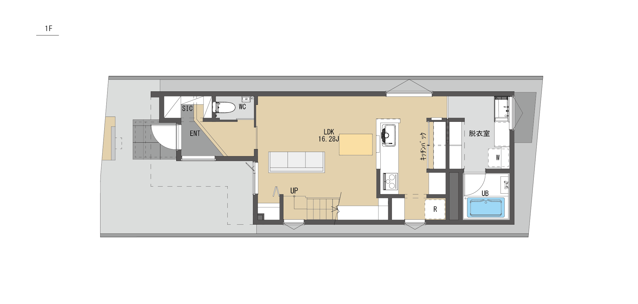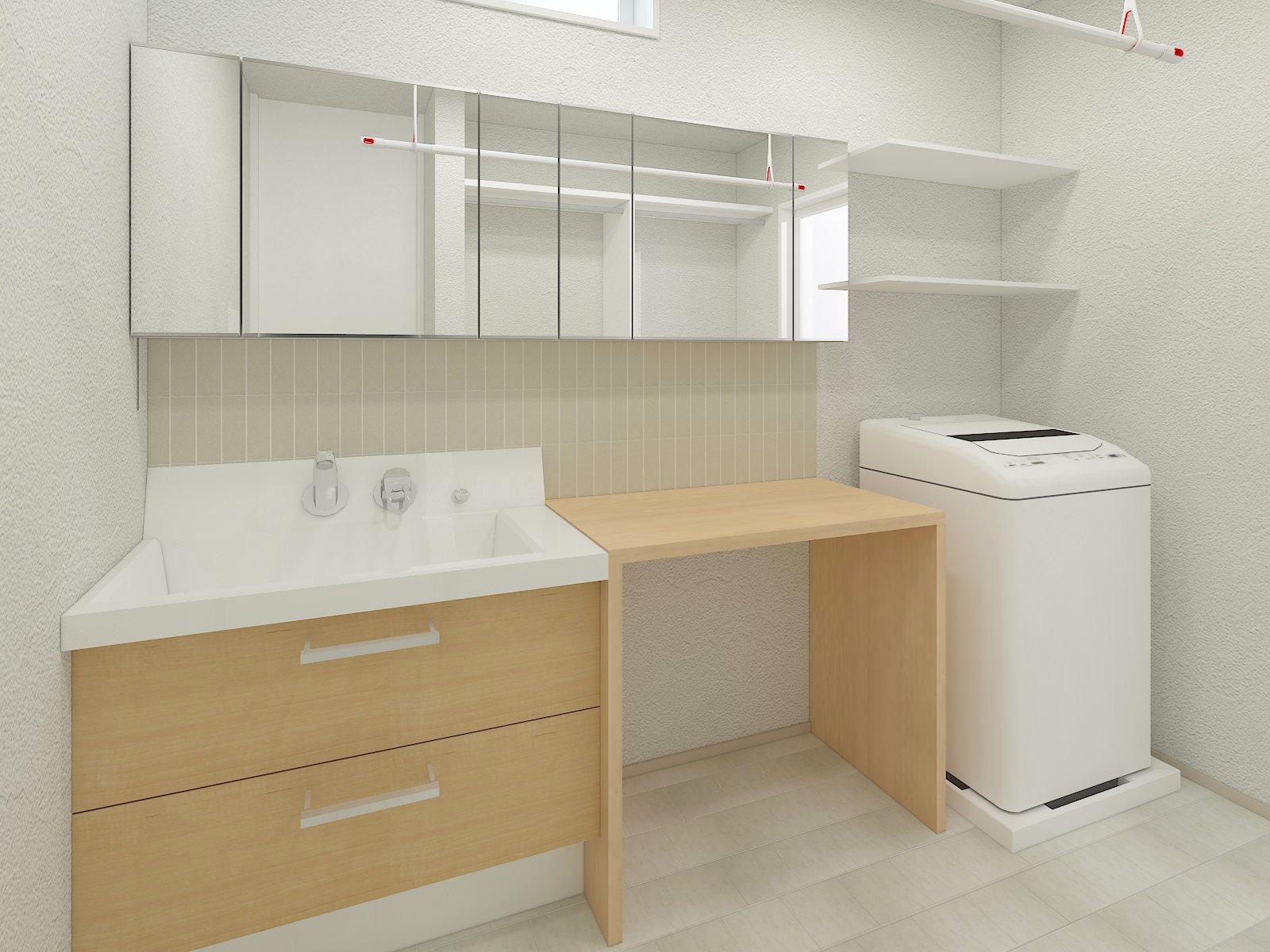 玄関まわりのSIC、キッチン横のパントリー、キッチンバック 脱衣スペース等各所に設けた収納が、それぞれの場所で必要なものを受け止める計画に。 日用品やストック類、細かな生活道具まで、 使いやすさと見え方の両方に配慮しながら整えています。 LDKは16.28帖。 物の居場所をあらかじめ組み込むことで、日々の動きが自然に収まり、 すっきりとした空間を保ちやすい住まいです。