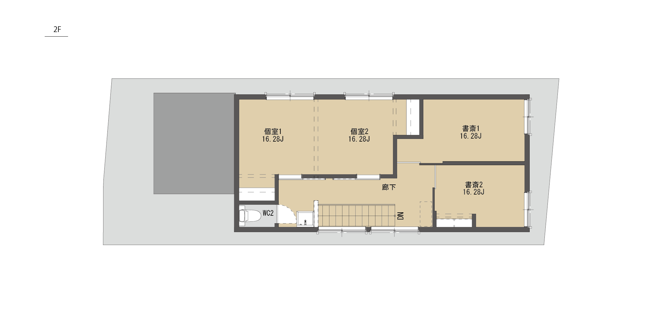 限られた敷地条件の中で、駐車スペースを確保しながら、1階にはLDKと水まわり、2階には個室と書斎を配置。 必要な機能を整理し、2階建ての中に無理なく収めています。 動線と使い方を整えることで、面積以上の暮らしやすさを成立させた住まいです。